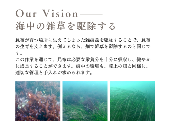 私は、昆布が本来持つ力を信じ、再び豊かな海を取り戻したいと強く願っています。そのためには、昆布が自ら成長できる漁場環境を整えることが何よりも重要です。