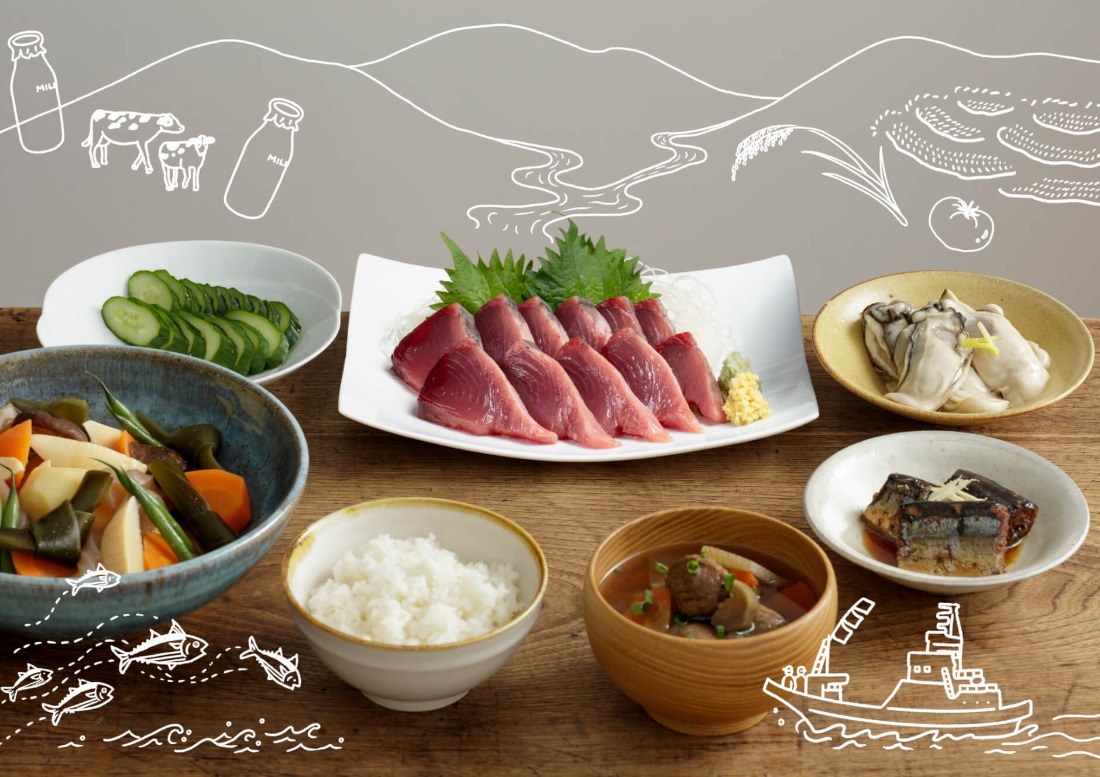 美しいリアスの海、緑豊かな山や川など、恵まれた自然環境に囲まれた気仙沼では、海からは魚類、貝類、海藻といった新鮮な魚介類が手に入り、里には米や野菜、山には山菜・キノコ類など大地の恵みが多く実ります。生産者も消費者も自然を敬い、そこからもたらされる四季折々の食材をありがたくいただくことで、豊かな食文化が育まれてきました。