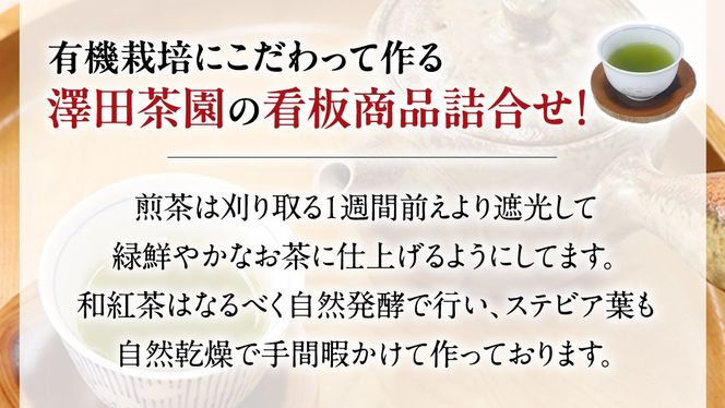 ステビア和紅茶…和紅茶に自園で栽培したハーブのステビア粉末を混ぜて糖質オフで甘く仕上げました。