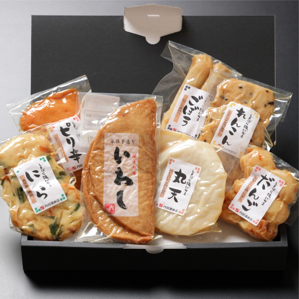 | 内容量 | ・いわし半月天(2枚入り)×1 ・にら天(3枚入り)×1 ・れんこん天(3枚入り)×1 ・ピリ辛天(3枚入り)×1 ・丸天(3枚入り)×1 ・ごぼう天(2本入り)×1 ・だんご天(6個入り)×1 |