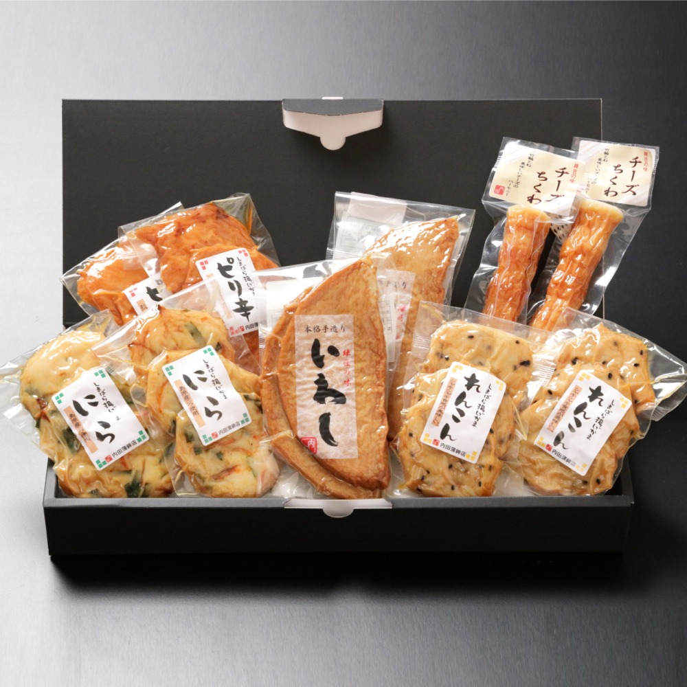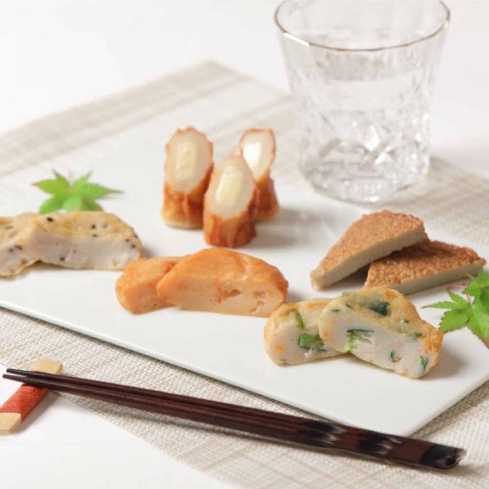 | 内容量 | ・いわし半月天(2枚入り)×2 ・にら天(3枚入り)×2 ・れんこん天(3枚入り)×2 ・ピリ辛天(3枚入り)×2 ・チーズちくわ(1本入り)×2 |