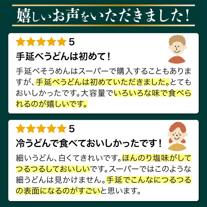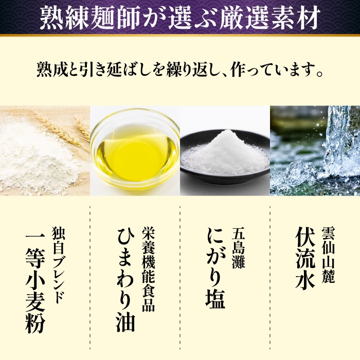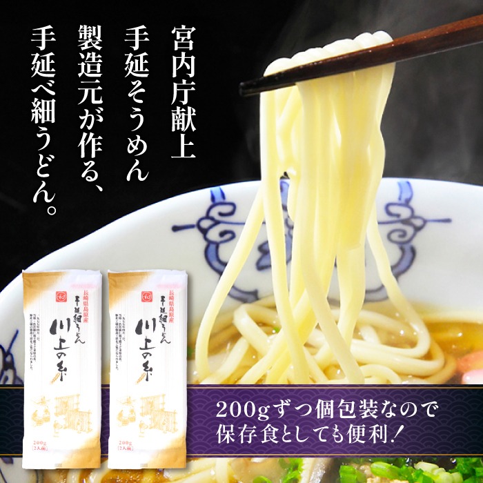 手延べ細うどんは、高品質の小麦粉・五島灘のにがり塩・無添加ひまわり油・雲仙山麓の伏流水を原料に、3世代の麺師が伝統の業”手延べ製法”で、熟成と引き延ばしを繰り返し作っています。 小麦の風味ともちもち食感が特徴で、煮込み・サラダ・ざるなど、四季を通じて様々なレシピでお召し上がりください。