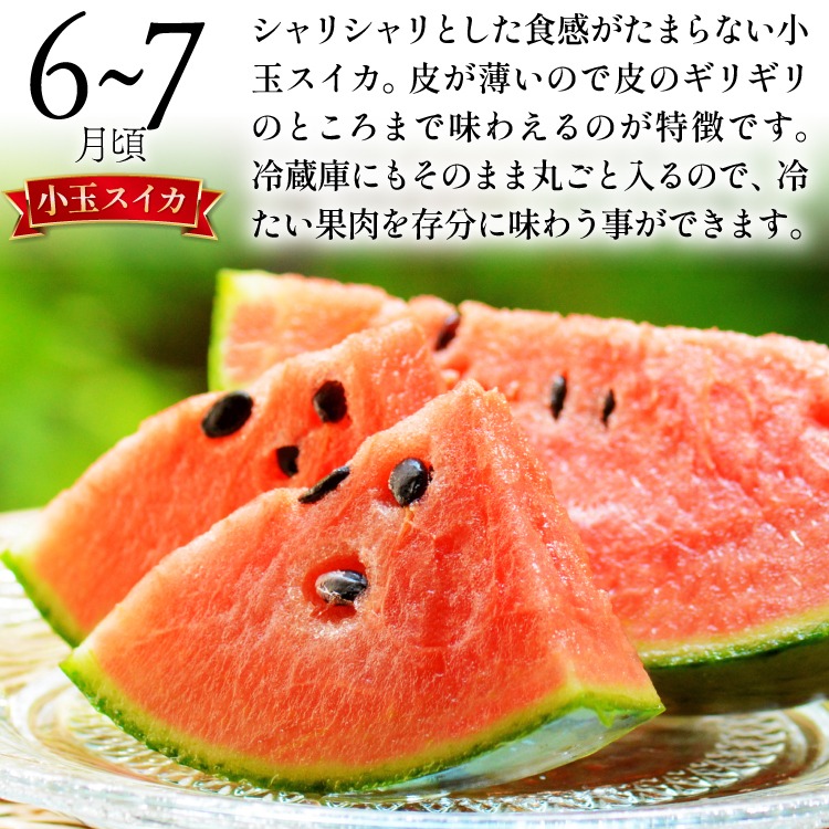 | 内容量 | 「1月〜2月」 イチゴ (苺):約1kg 「4月〜5月」 ビワ:約1kg(4パック) 「6月〜7月」小玉スイカ:約5〜6kg 「8月〜9月」 ブドウ (葡萄):約1kg 「10月〜11月」 アールスメロン:約3kg(2玉〜4玉) 「12月〜1月」 柑橘類:約5kg |