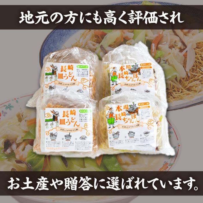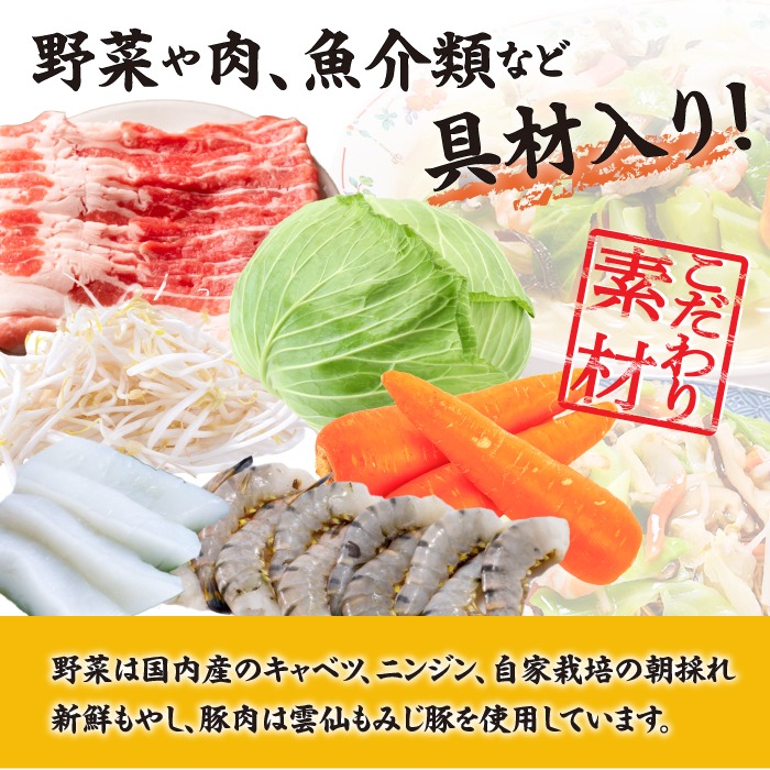 長崎を代表する郷土料理、長崎ちゃんぽんと皿うどんを野菜や肉、魚介類など具材入りで冷凍便でお届けします。