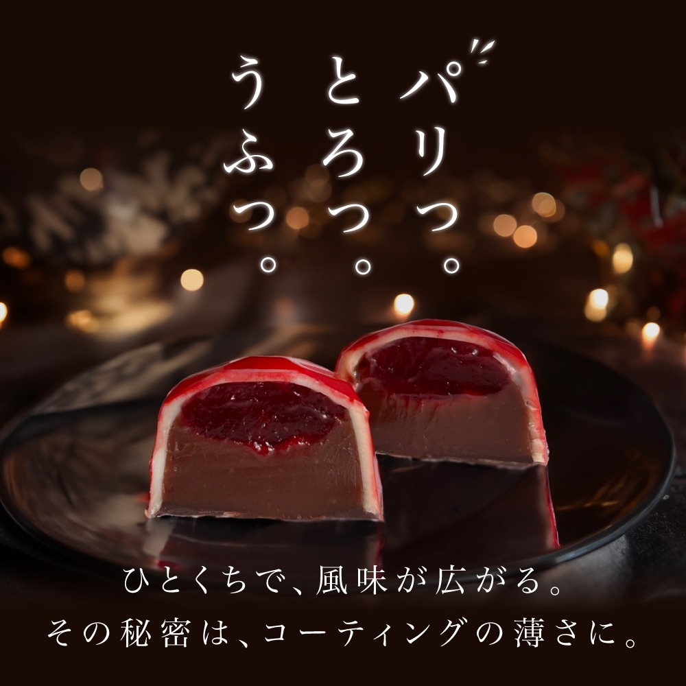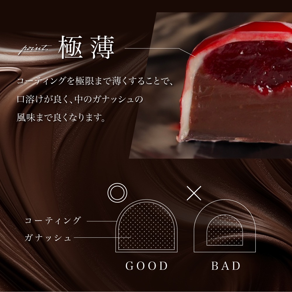 ●こだわり 1.『口溶けの良さはコーティングの薄さにあり!』 全く同じチョコレートでも、コーティングの厚さで、味わいが変わるのがチョコレートの面白いところ。 コーティングが薄い方が、口溶けが良く、中のガナッシュの風味まで良くなります。 だからこそ「コーティングを薄く均一にできるか」がプロの手腕。 噛むと「パリッ」と薄いコーティングをぜひ感じて下さい。 各フレーバー個性豊かなガナッシュが口いっぱいに広がります。