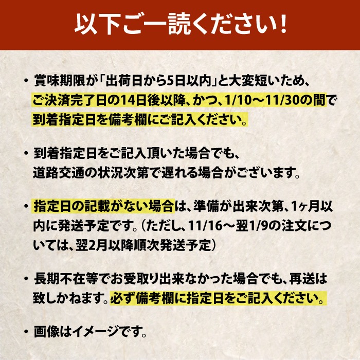賞味期限が「出荷日から5日以内」と大変短いため、ご決済完了日の14日後以降、かつ、1/10~11/30の間で到着指定日を備考欄にご記入ください。