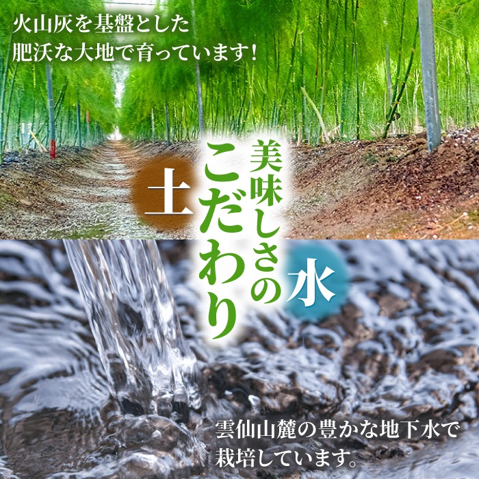 こだわりポイント2「きれいな水」 南島原市は、雲仙山麓から南へ広がる肥沃で豊かな地下水を含む大地です。 その大地から地下水を汲み上げ栽培しています。 ※島原半島は、火山岩を基盤とした土壌なので、ミネラルが豊富で肥沃な大地の恩恵を受けています。