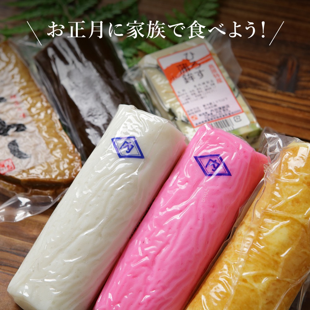 | 内容量 | ・板付蒲鉾(赤) 約200g×1本 ・板付蒲鉾(白) 約200g×1本 ・昆布巻 約180g×1本 ・伊達巻 約310g×1本 ・ひろす蒲鉾 約170g×1本 ・いわし半月天(2枚入り) 約180g×1 |