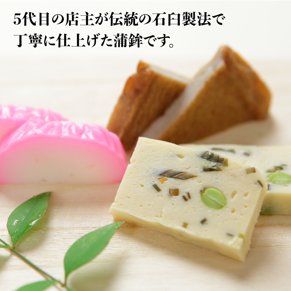 5代目の店主が伝統の石臼製法で丁寧に仕上げた蒲鉾です。