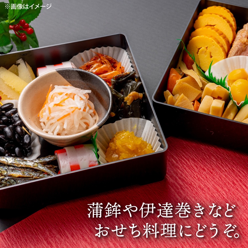 お正月の縁起物として食べられる「紅白板付蒲鉾」、「昆布巻」甘すぎない味付けの天然無着色の「伊達巻」。