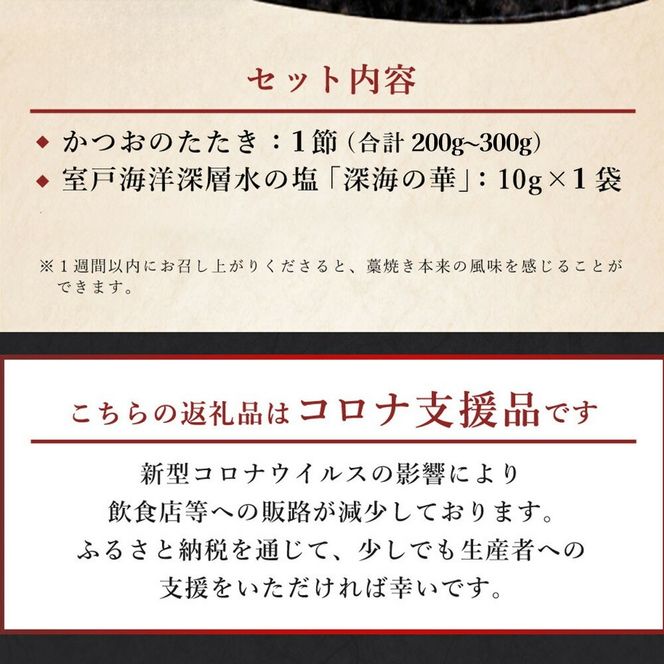 厳選かつおの完全わら焼きたたき 1節入り 室戸海洋深層水の塩付き かつおのたたき カツオのたたき 鰹 カツオ たたき 海鮮 冷凍