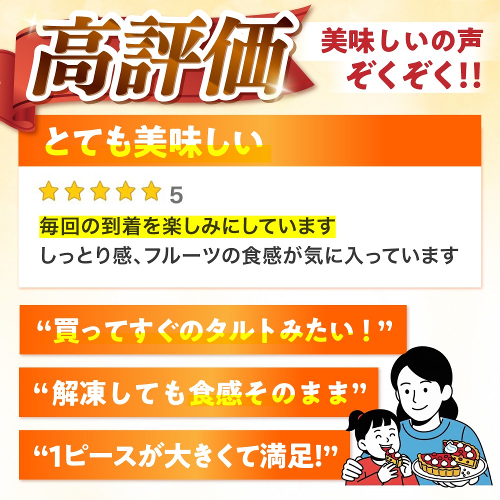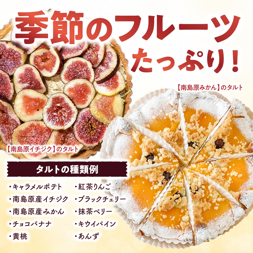 | 内容量 | ・キャラメルポテト ・南島原産イチジク ・南島原産みかん ・チョコバナナ ・黄桃 ・紅茶りんご ・ブラックチェリー ・抹茶ベリー ・キウイパイン ・あんず 上記内容の中から、旬のおすすめタルトを1ホール、合計12回お届けします。 |