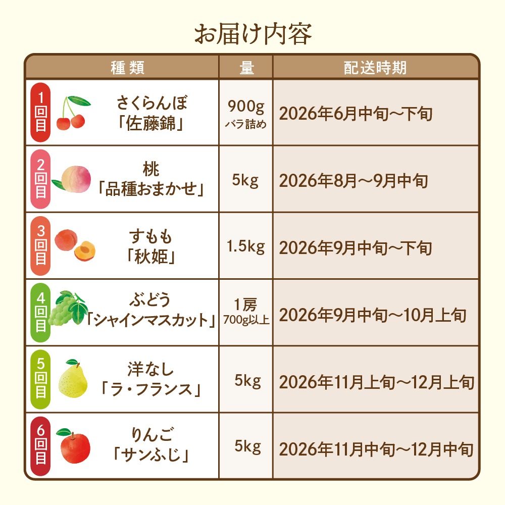 【2026年先行予約 6回 定期便】果樹王国を堪能コース 山形県 東根市 さくらんぼ もも プラム シャインマスカット ラ・フランス りんご hi999-045