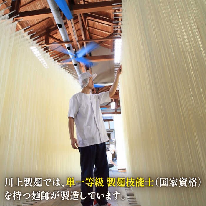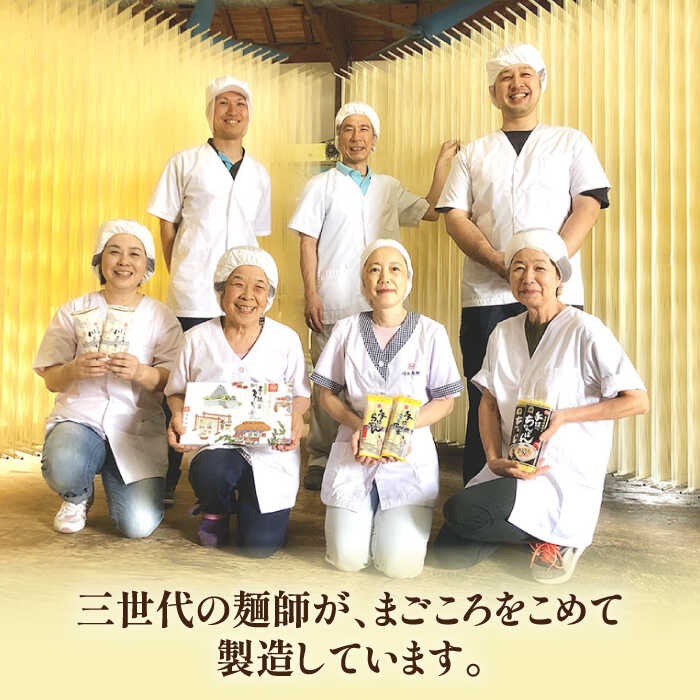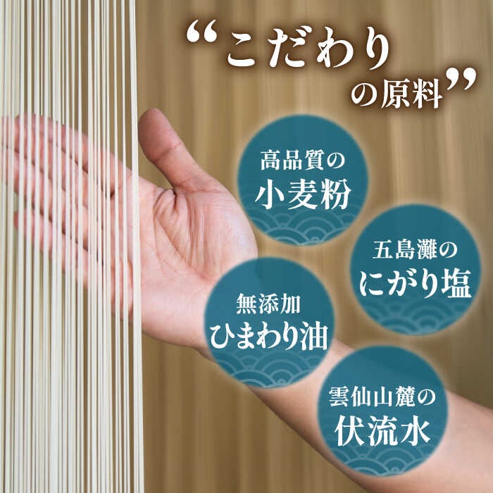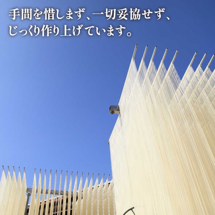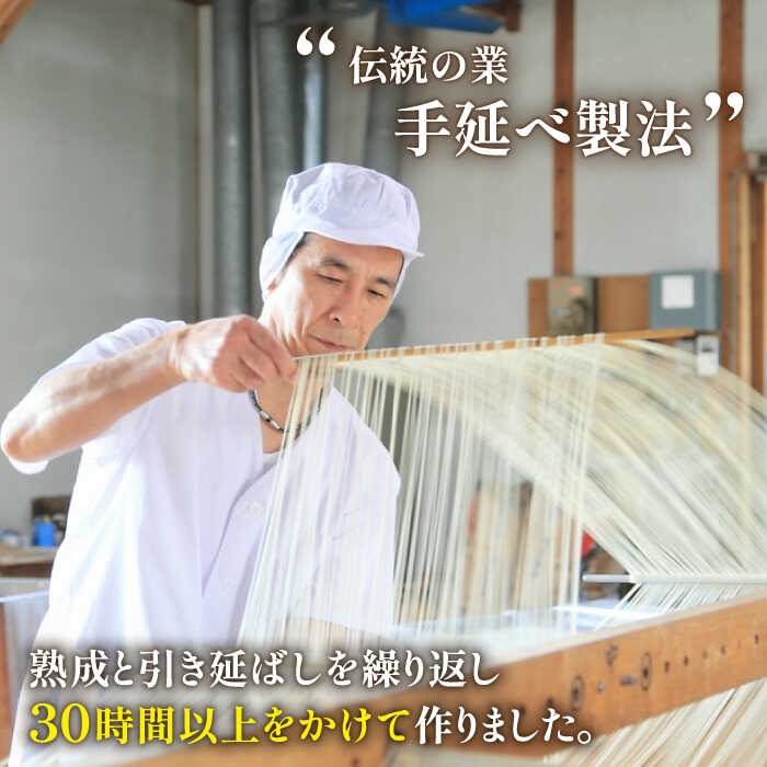 単一等級技能士(国家資格)を有する麺師が、伝統の業「手延べ製法」で、熟成と引き延ばしを繰り返し、30時間以上をかけて製麺しています。