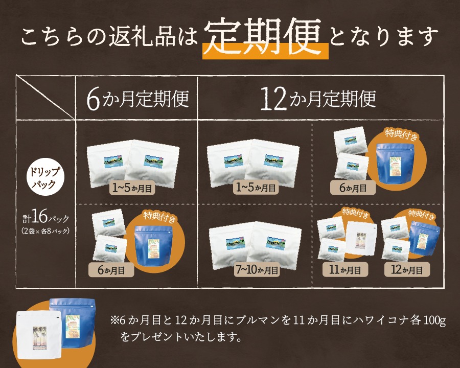 特典は豆・粉と同じく「6か月目、ブルマン」(各ドリップ12g×5ケ)をプレゼントいたします。
