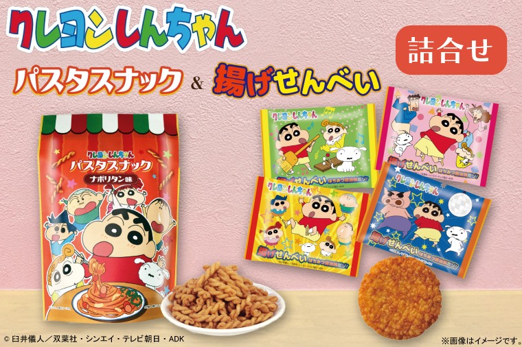 春日部市の菓子メーカー「三州製菓」の、『クレヨンしんちゃん』パッケージで包んだパスタスナック2袋と、揚げせんべい12枚の詰合せです。