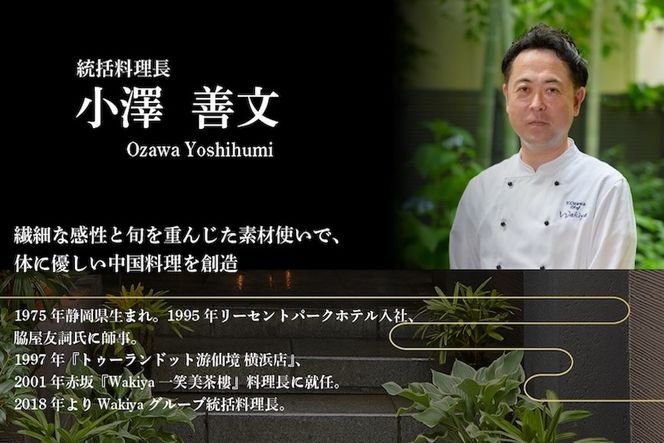 2011年『トゥーランドット臥龍居』料理長、2018年8月よりWakiyaグループ統括料理長を務める。