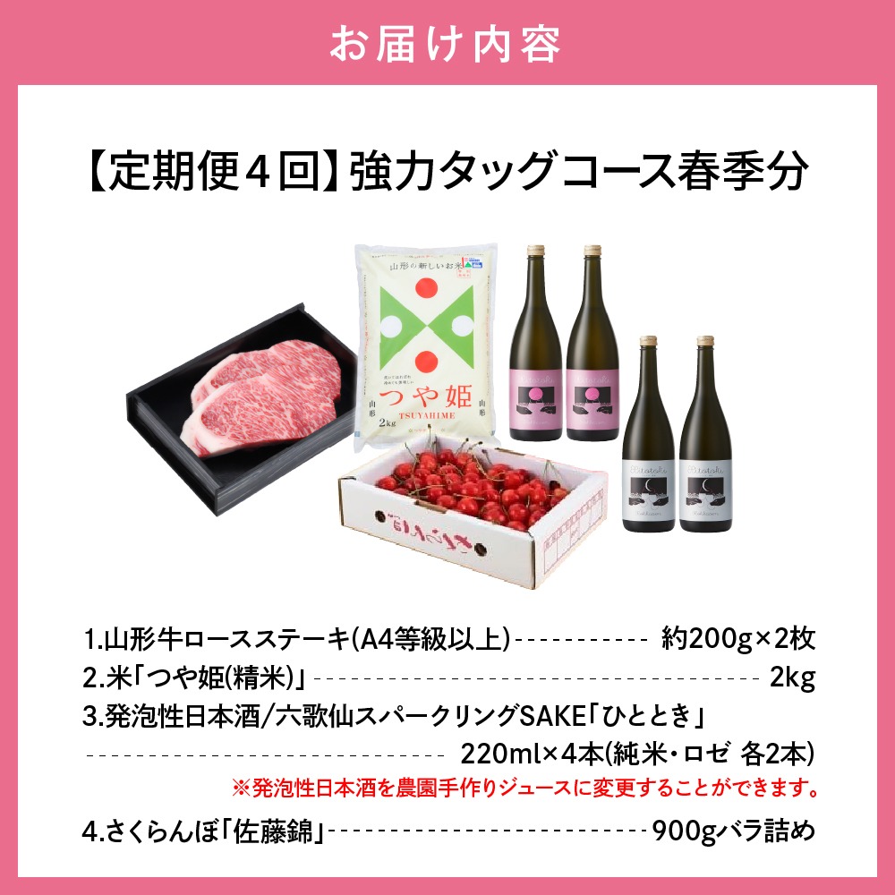 【定期便4回】強力タッグコース春季分(2026年5月スタート) さくらんぼ 山形牛ステーキ つや姫 酒 hi999-040
