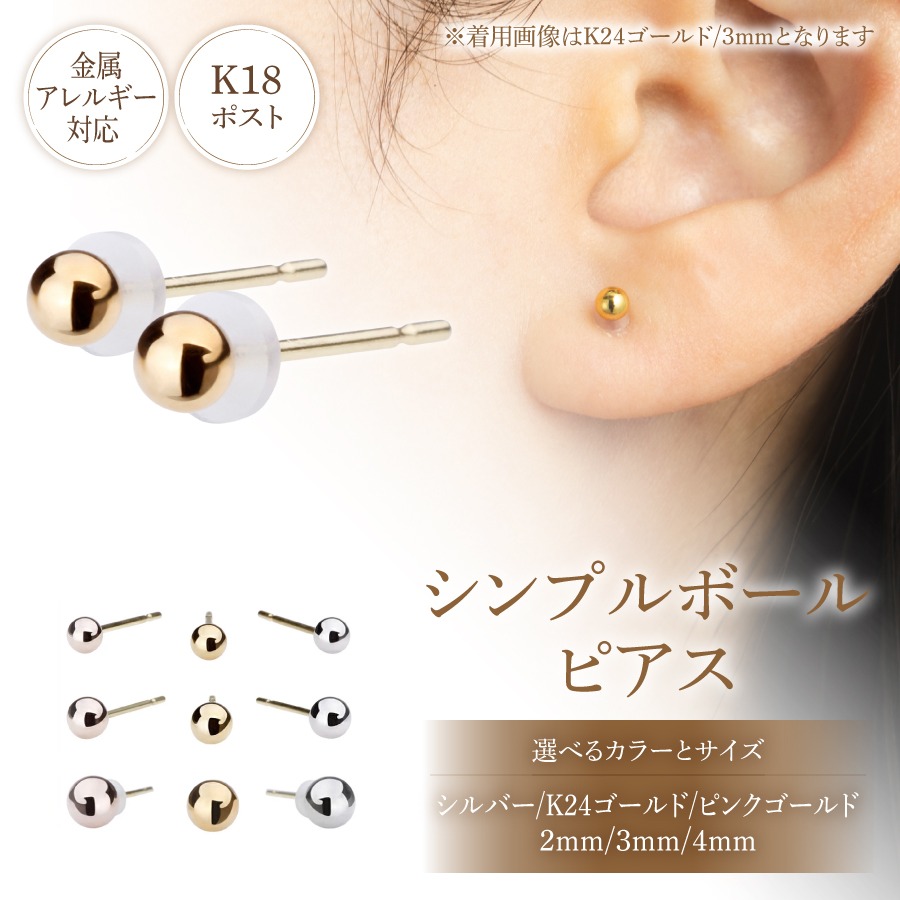 K18ポスト 金属アレルギー対応 シンプルボールピアス 【選べるカラー/サイズ】 (シルバー/K24ゴールド/ピンクゴールド) アクセサリー ピアス K18 メタルボール ニッケルフリー 山梨 富士吉田