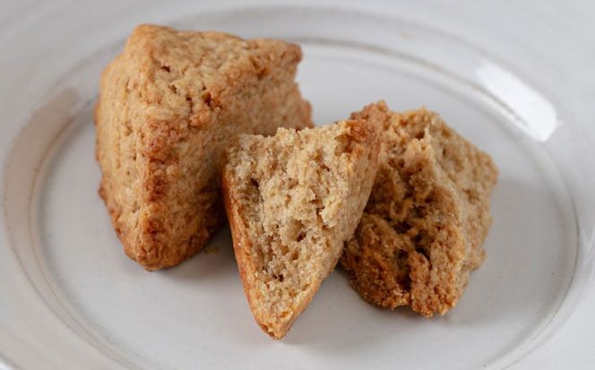 プレーンスコーン: 薄力粉(佐賀県産)、全粒粉(福岡県糸島産)、てんさい糖、有機豆乳、なたね油、塩(糸島産)/ベーキングパウダー(アルミフリー)