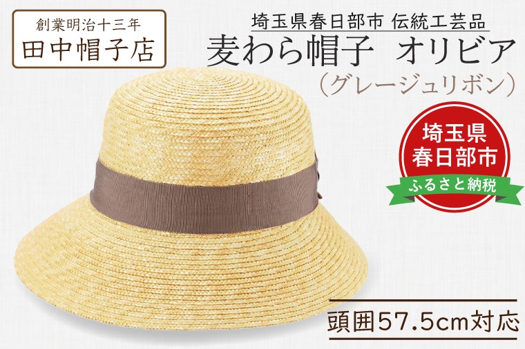 AN095 春日部市伝統工芸品 田中帽子店 麦わら帽子 オリビア グレージュリボン 頭囲57.5cm (UK-H144-GG)
