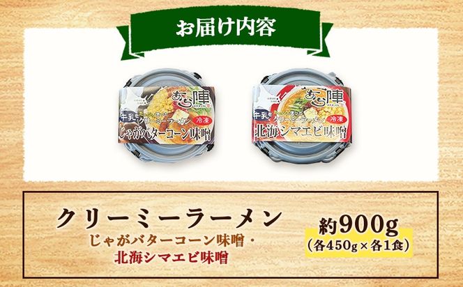 クリーミーラーメン ( じゃがバターコーン味噌 ・ 北海シマエビ味噌 ) 各450g ×各1食 計900g 「あら陣」中標津本店で人気のラーメン | ふるさと納税 北海道 中標津 なかしべつ 味噌 味噌ラーメン ラーメン らーめん じゃがバター コーン エビ えび 海老 冷凍食品 お取り寄せ ワンストップ マイページ あら陣株式会社 中標津町
