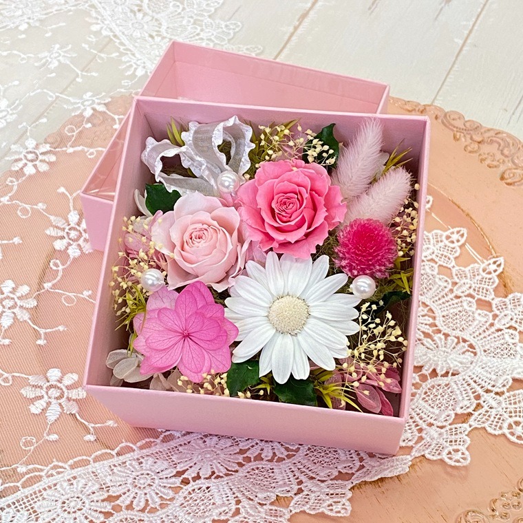 可愛らしさと上品さをぎゅっと詰め込んだボックスアレンジです。