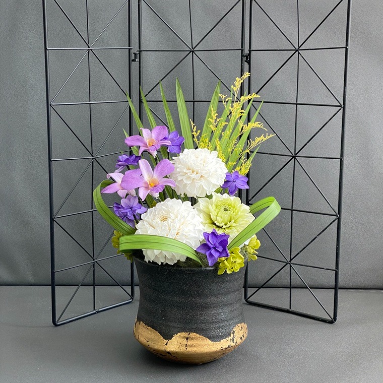 金箔があしらわれた高級ベースに大輪のダリアとデンファレを贅沢に使用した、豪華な和モダンアレンジです。