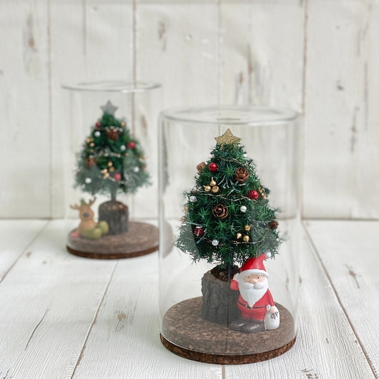 ヒムロ杉を使用したミニチュアのクリスマスツリーにサンタを添えた温かみのあるコルクボトルです。