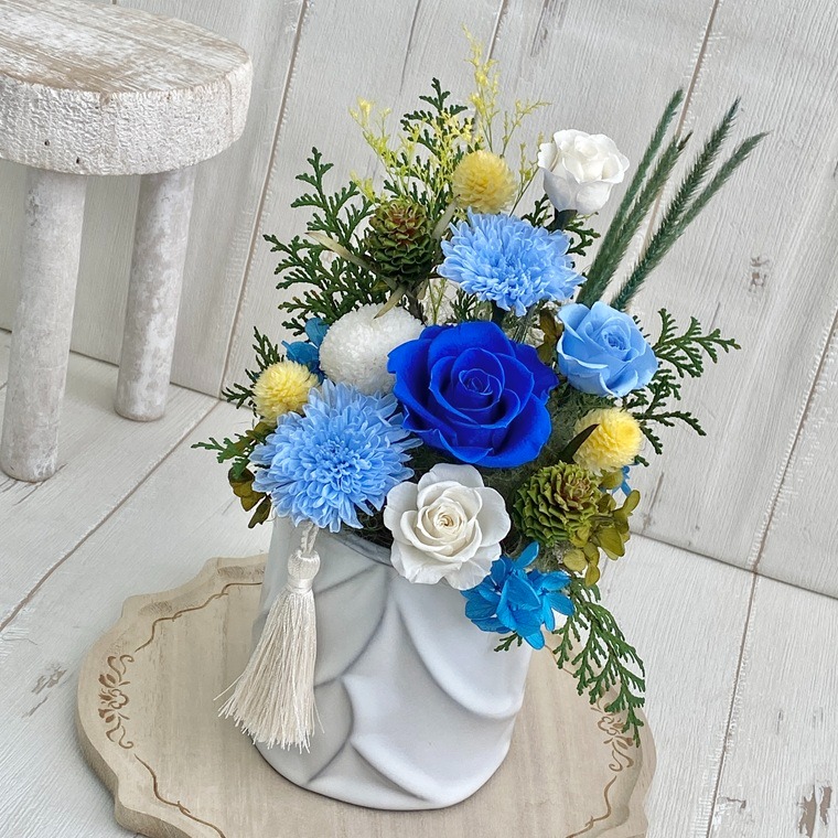 青や白の菊とバラを贅沢に使用した、落ち着きのある洗練されたアレンジです。贈り物にもおすすめです。