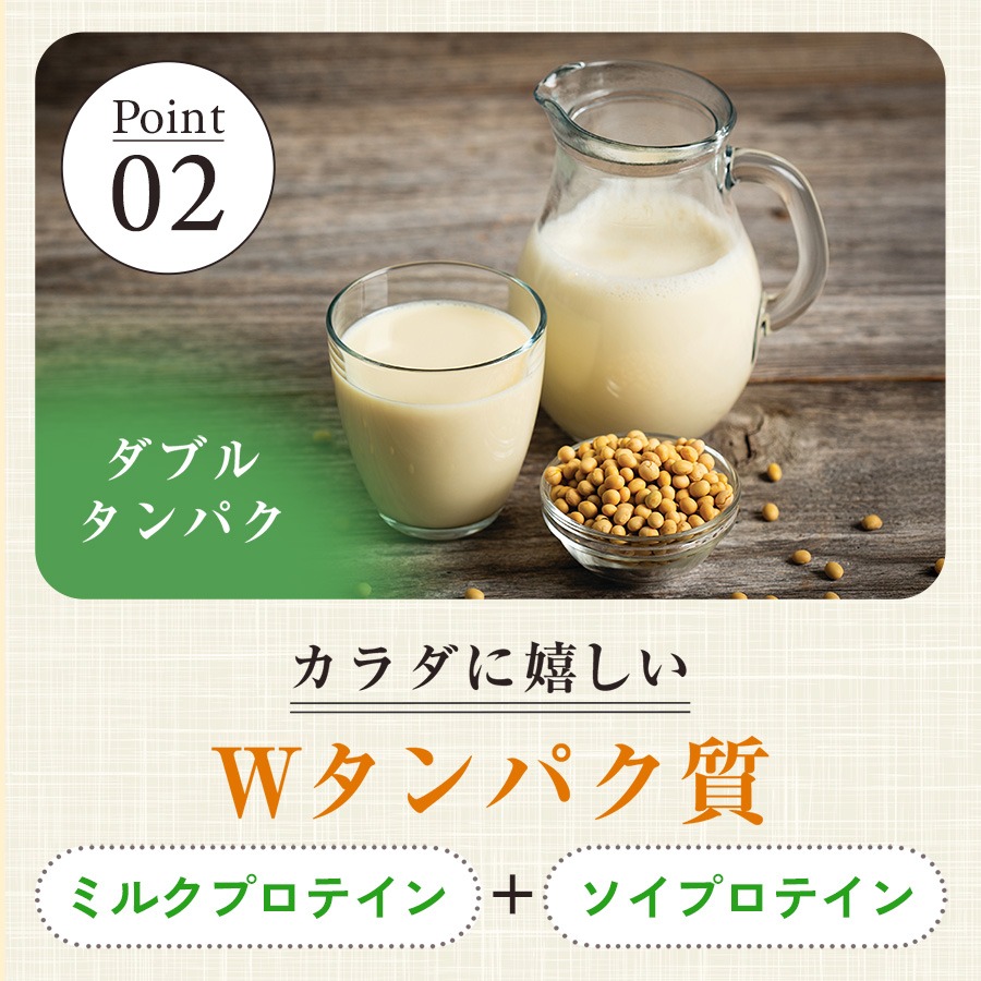 また、ソイとミルクのWタンパクの配合によりタンパク質等の成分の持続的な吸収が期待されます。
