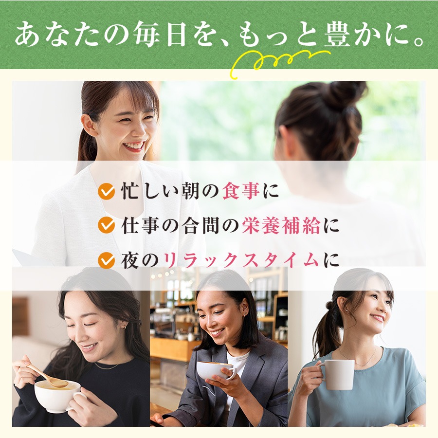 お湯を注ぐだけで簡単に作れるので、朝食以外にもランチや夜食、間食にぴったりです。