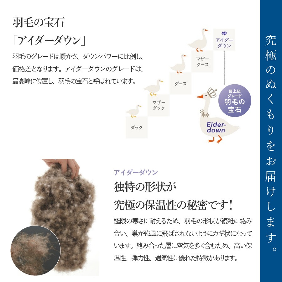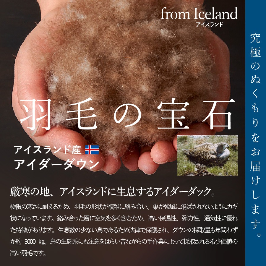 アイダーダウンは弾力に富み、卓越した保温性から「羽毛の宝石」と呼ばれています。