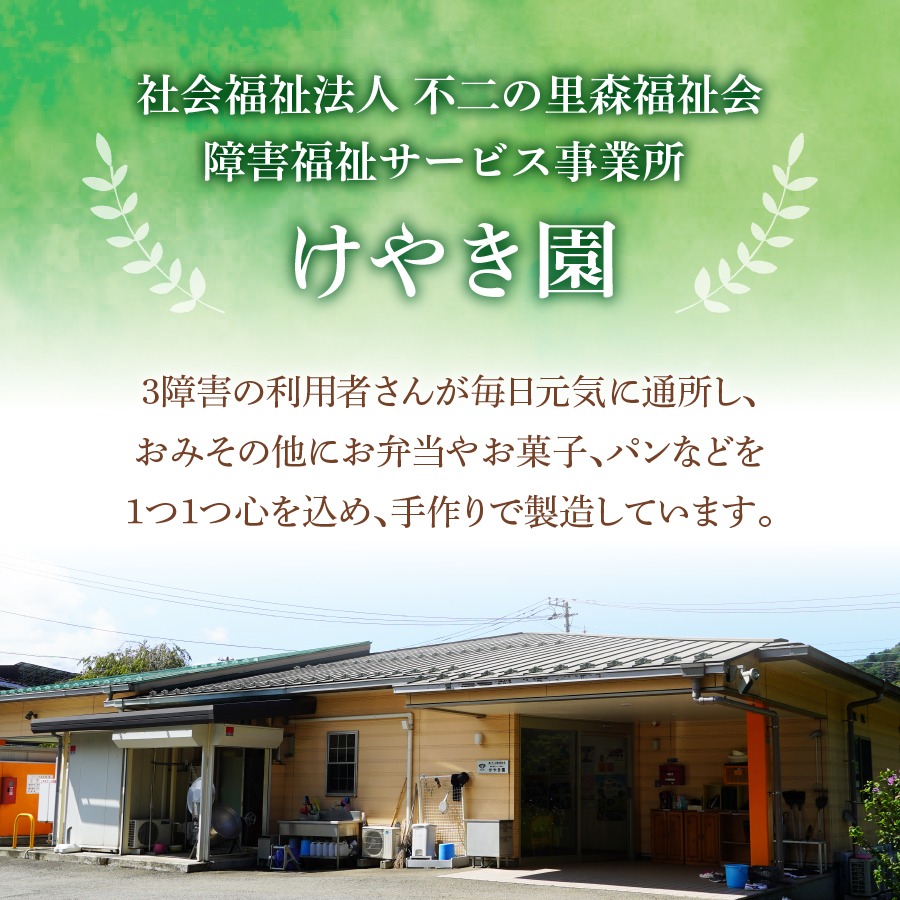 社会福祉法人 不二の里森福祉会 障害福祉サービス事業所けやき園では、3障害の利用者さんが毎日元気に通所し、お味噌の他にお弁当やお菓子、パンなどを製造しています。