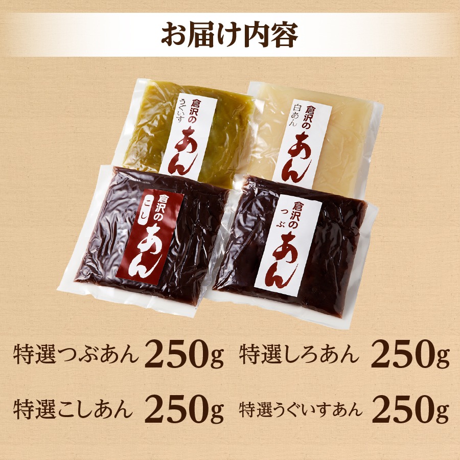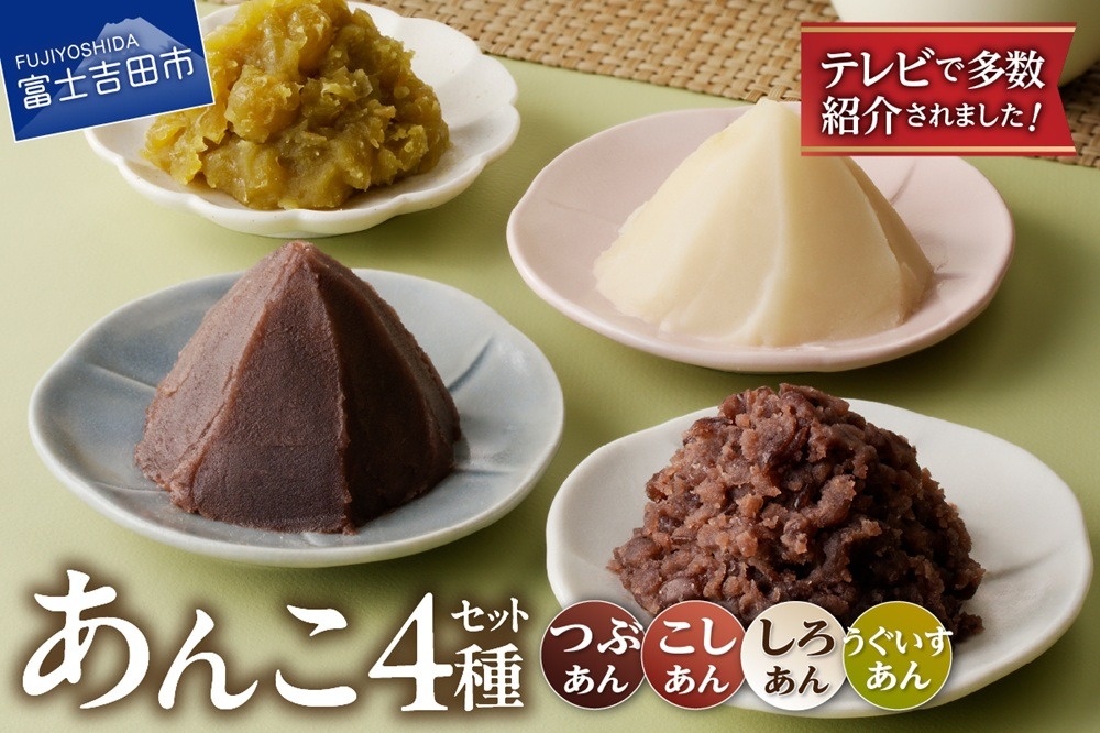 富士山の伏流水を使用したあんこセット(こしあん250g・つぶあん250g・白あん250g・うぐいすあん250g) 餡子 和菓子 小豆 無添加 老舗 山梨 富士吉田