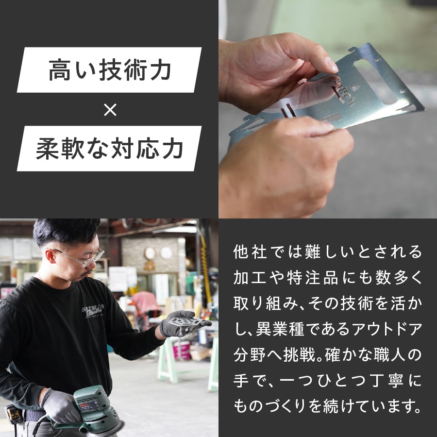 日本国内メーカー製のステンレスを使用し、耐久性、耐熱性、携帯性を徹底追及。