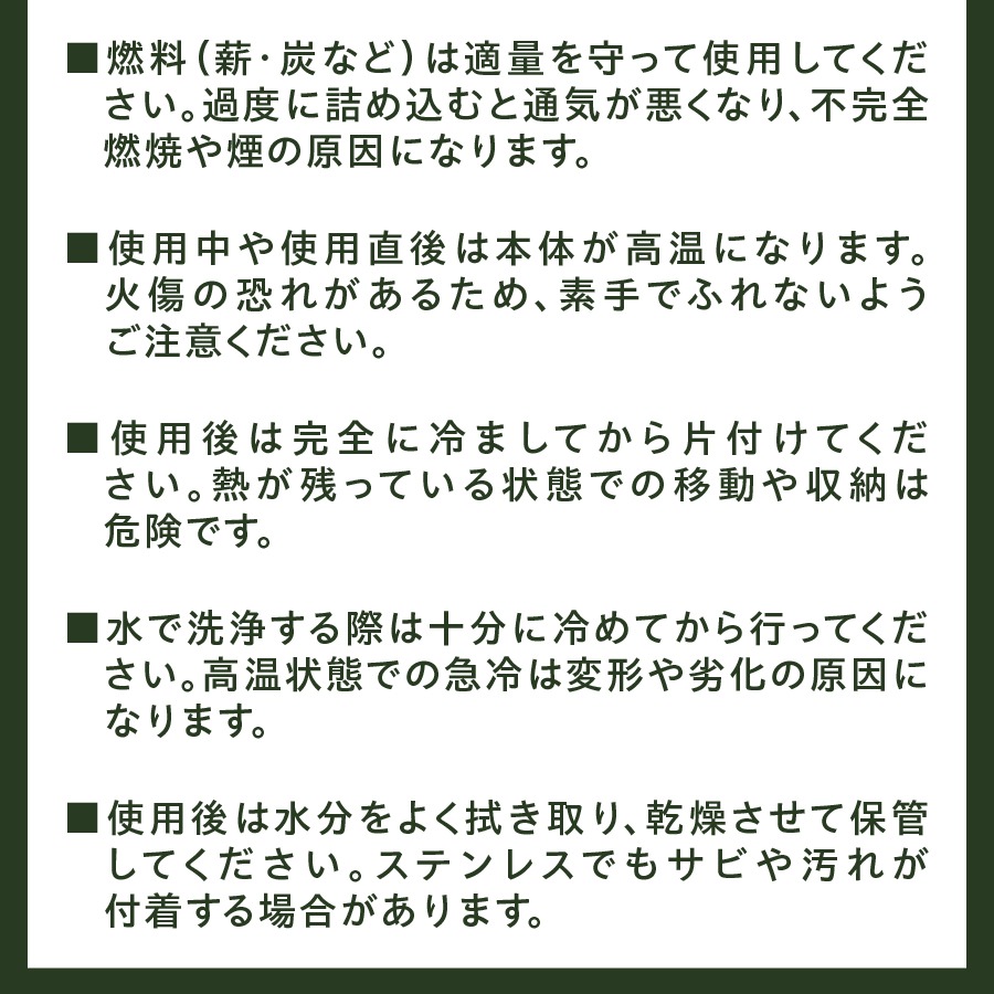 ・燃料(薪・炭など)は適量を守って使用してください。(過度に詰め込むと通気が悪くなり、不完全燃焼や煙の原因になります。)