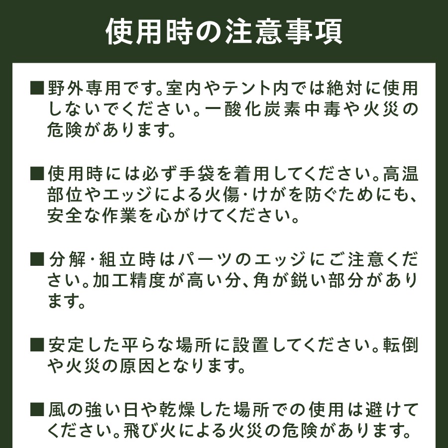 ・野外専用です。室内やテント内では絶対に使用しないでください。(一酸化炭素中毒や火災の危険があります。)