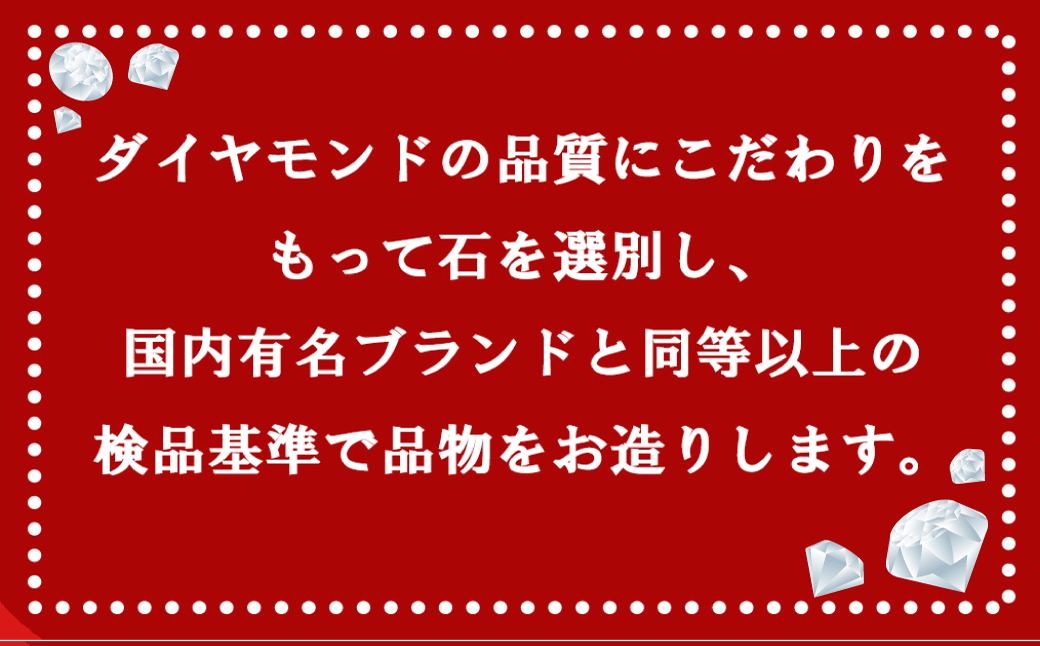 こちらの品物は大月市でPT950を鋳造して作成した品物になります。弊社はダイヤモンドを専門に取り扱っている業者でございますので、ダイヤモンドの品質に拘りをもって石を選別し、国内有名ブランドと同等以上の検品基準で品物を作成してお送りいたします。