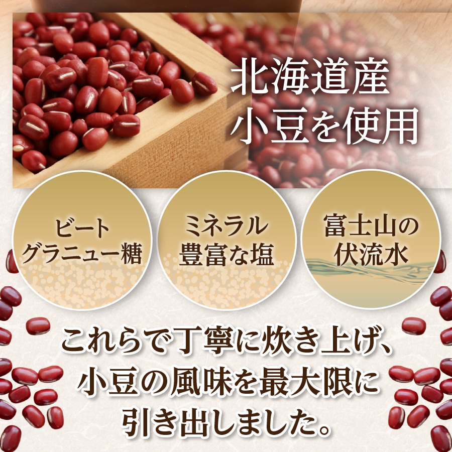 北海道産小豆を、ビートグラニュー糖とミネラル豊富な塩、そして富士山の伏流水で丁寧に炊き上げ、小豆の風味を最大限に引き出しました。ほんのり効いた塩味が甘さを引き立て、老若男女に親しまれるやさしい味わいに。