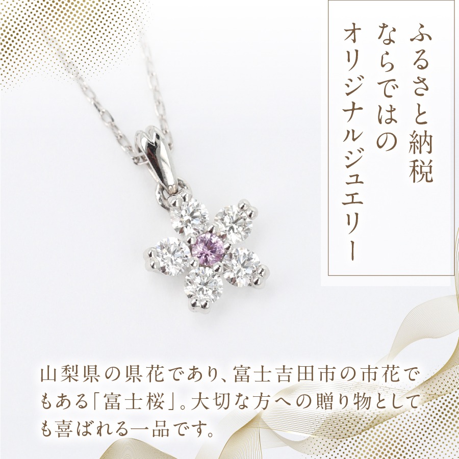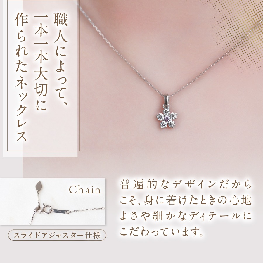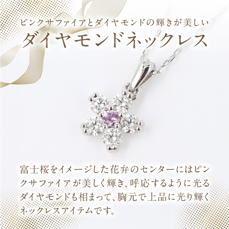 富士桜をイメージした花弁のセンターにはピンクサファイアが美しく輝き、呼応するように光るダイヤモンドも相まって、胸元で上品に光り輝くネックレスアイテムです。