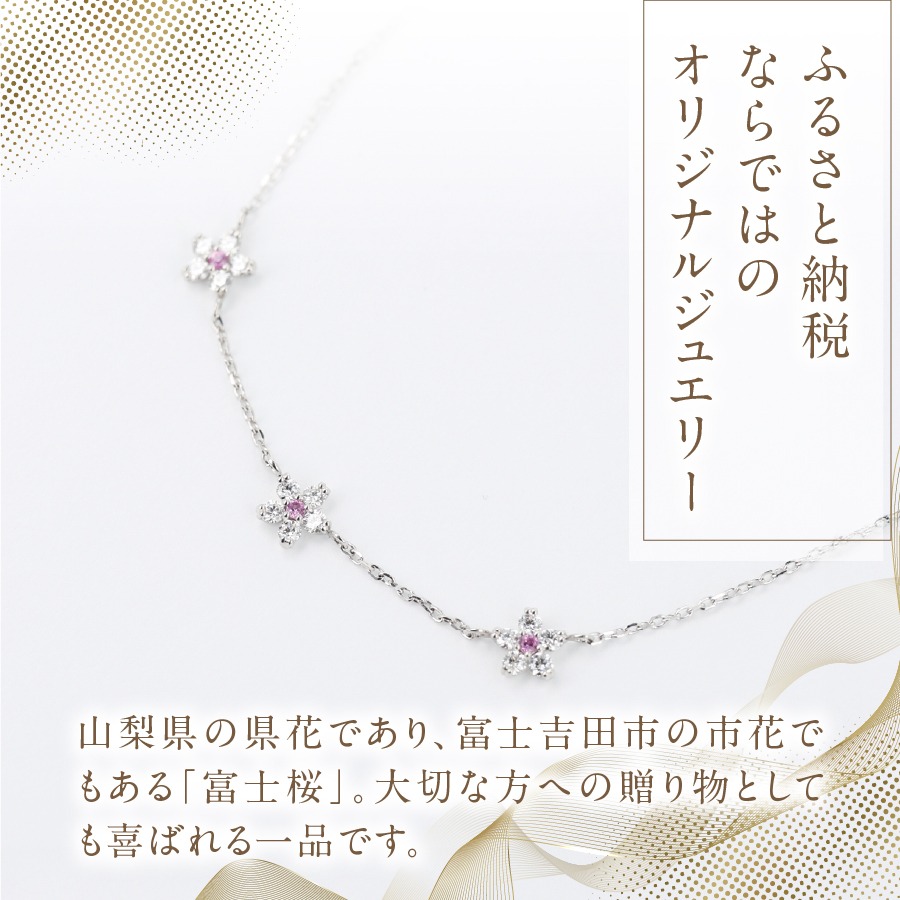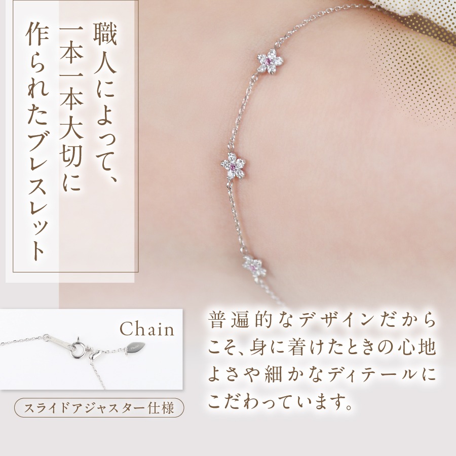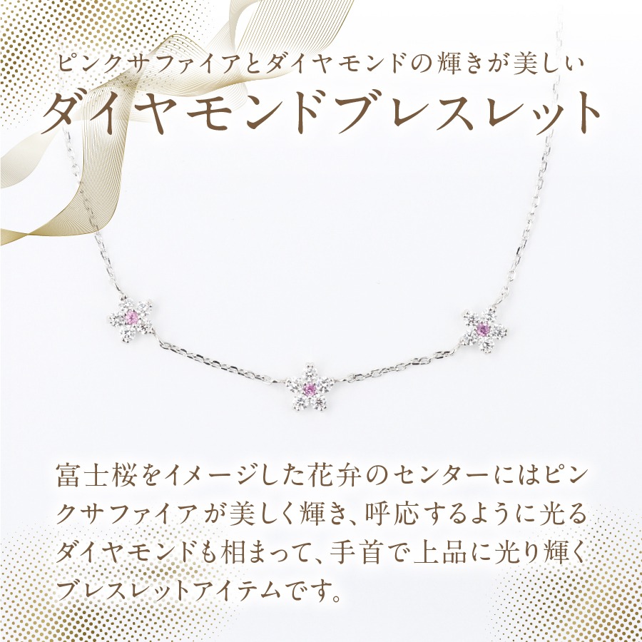 富士桜をイメージした花弁のセンターにはピンクサファイアが美しく輝き、呼応するように光るダイヤモンドも相まって、手首で上品に光り輝くブレスレットアイテムです。