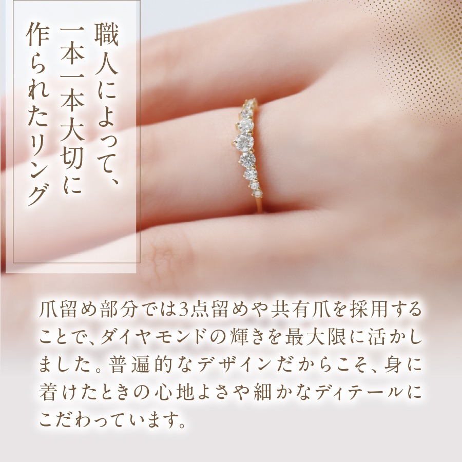 また、爪留め部分では、3点留めや共有爪を採用することで、ダイヤモンドの輝きを最大限に活かしたデザインになっています。