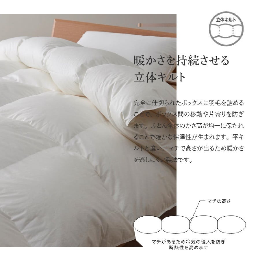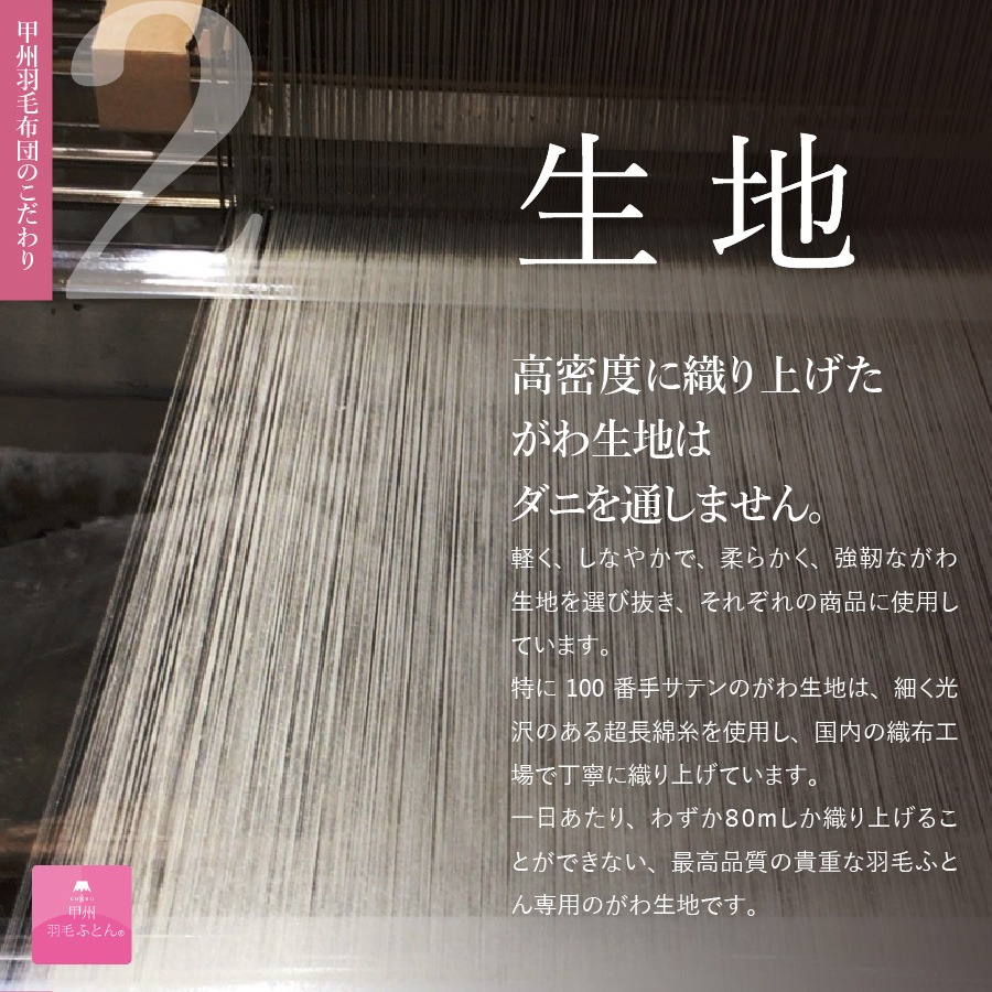 豊富な天然水でキレイに磨き上げた羽毛を使用し、熟練の職人が一枚一枚丁寧に仕上げています。