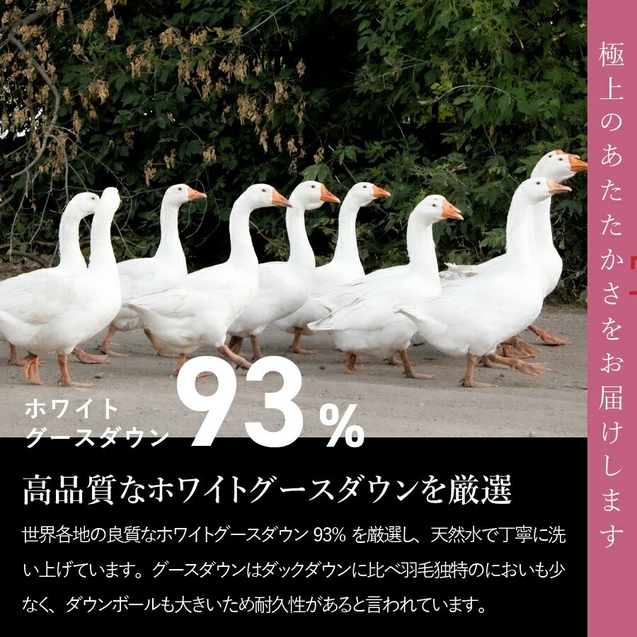 世界の産地より厳選されたホワイトグースダウン93%をたっぷり使用しています。