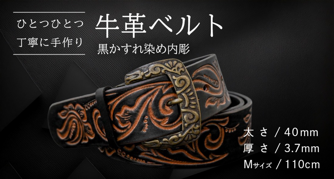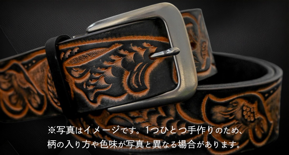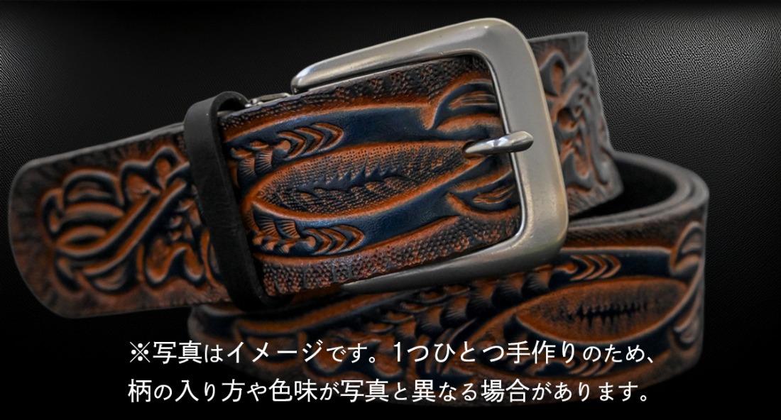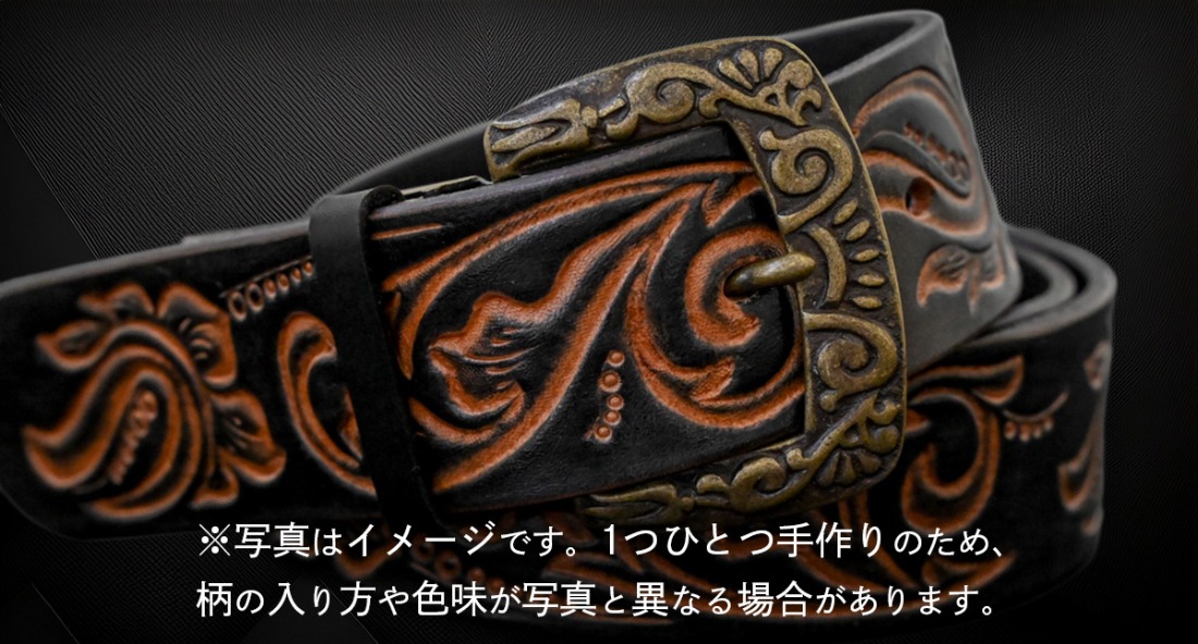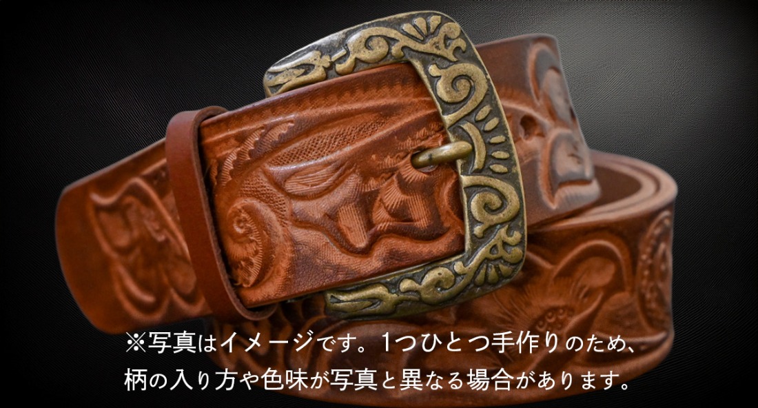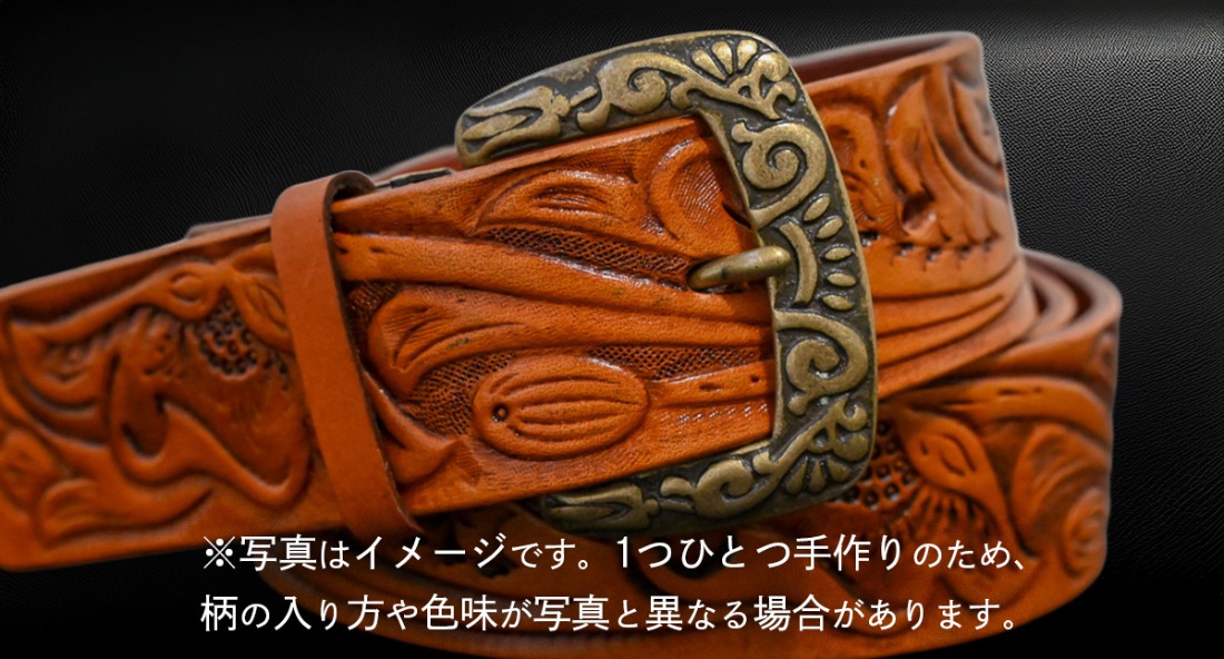 このベルトは、手作業で丸1日かけて柄を彫り、仕上げたものです。