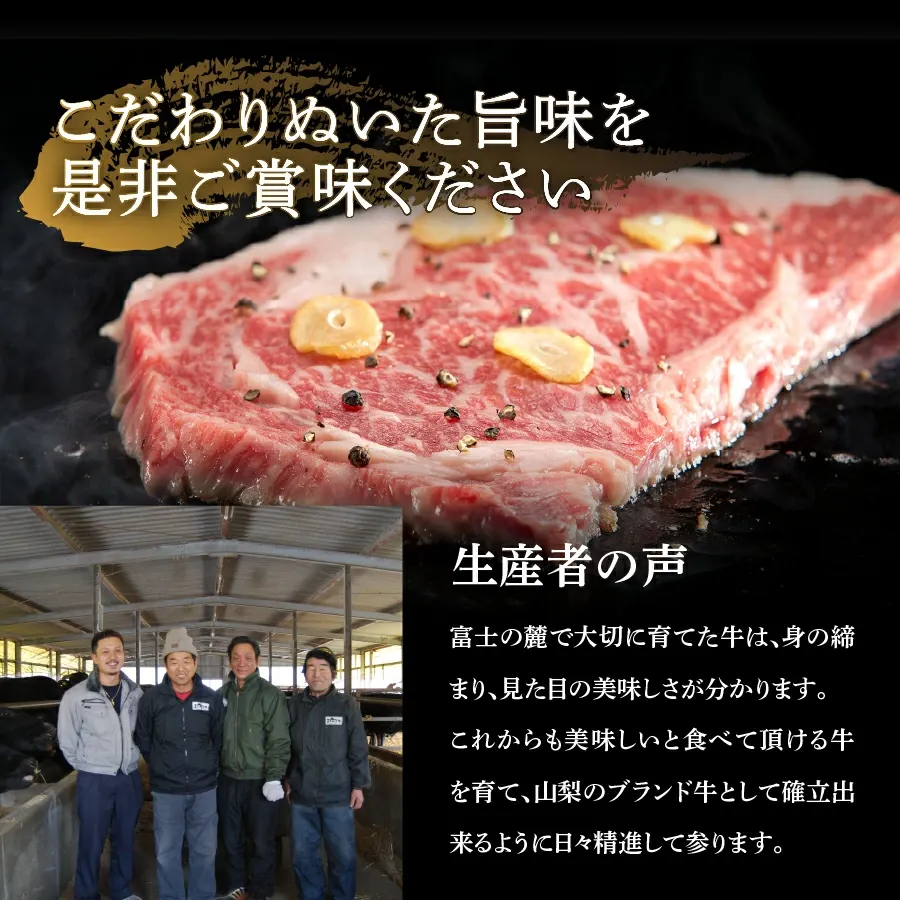 また、独自の生産プログラムに則り、富士山北麓の山梨県富士河口湖町の自然豊かな環境下で手間と時間を掛けてじっくりと飼育しているため豊かな風味と柔らかさ、ジューシーさを兼ね備えた牛肉に仕上げております。