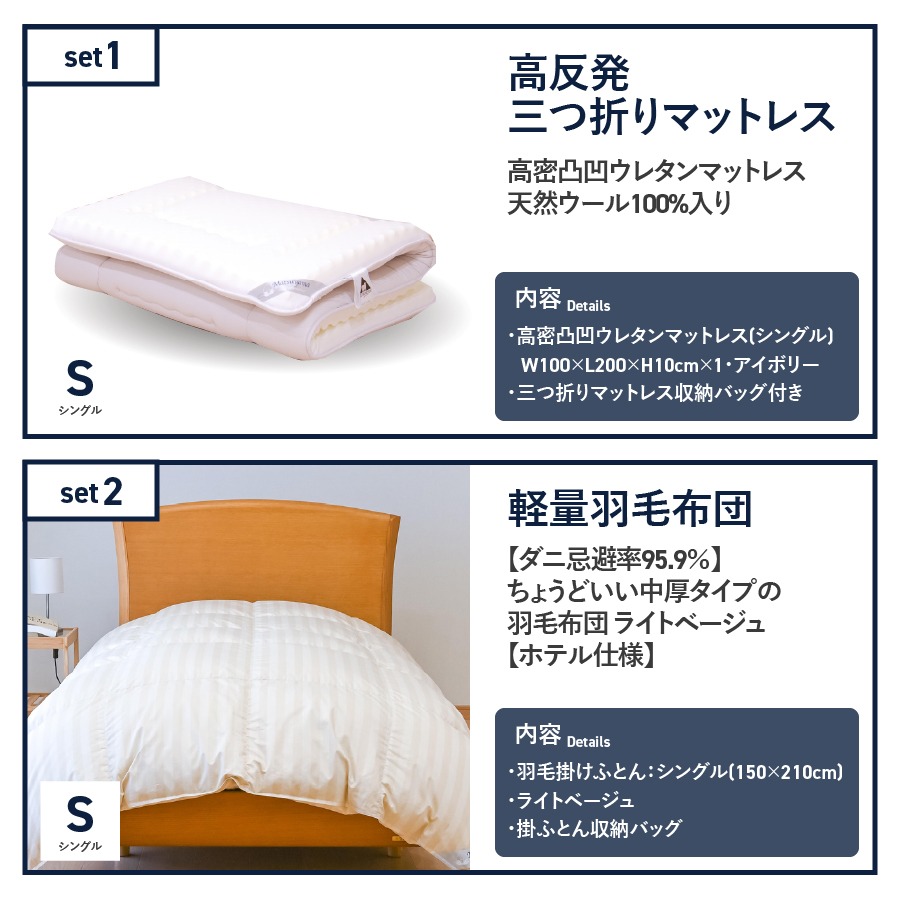 【快眠寝具セット】軽量羽毛布団+高反発三つ折りマットレス (シングル) 羽毛布団 掛け布団 合掛け 中厚 マットレス 点で支える 体圧分散 セット 寝具 ふとん 山梨 富士吉田