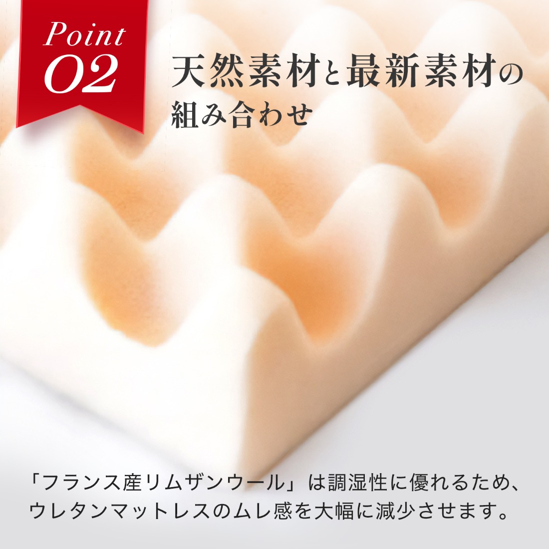 中わたには除湿力に優れた「フランス産リムザンウール」を使用し、ウレタンマットレスにつきもののムレ感を大幅に減少させました。