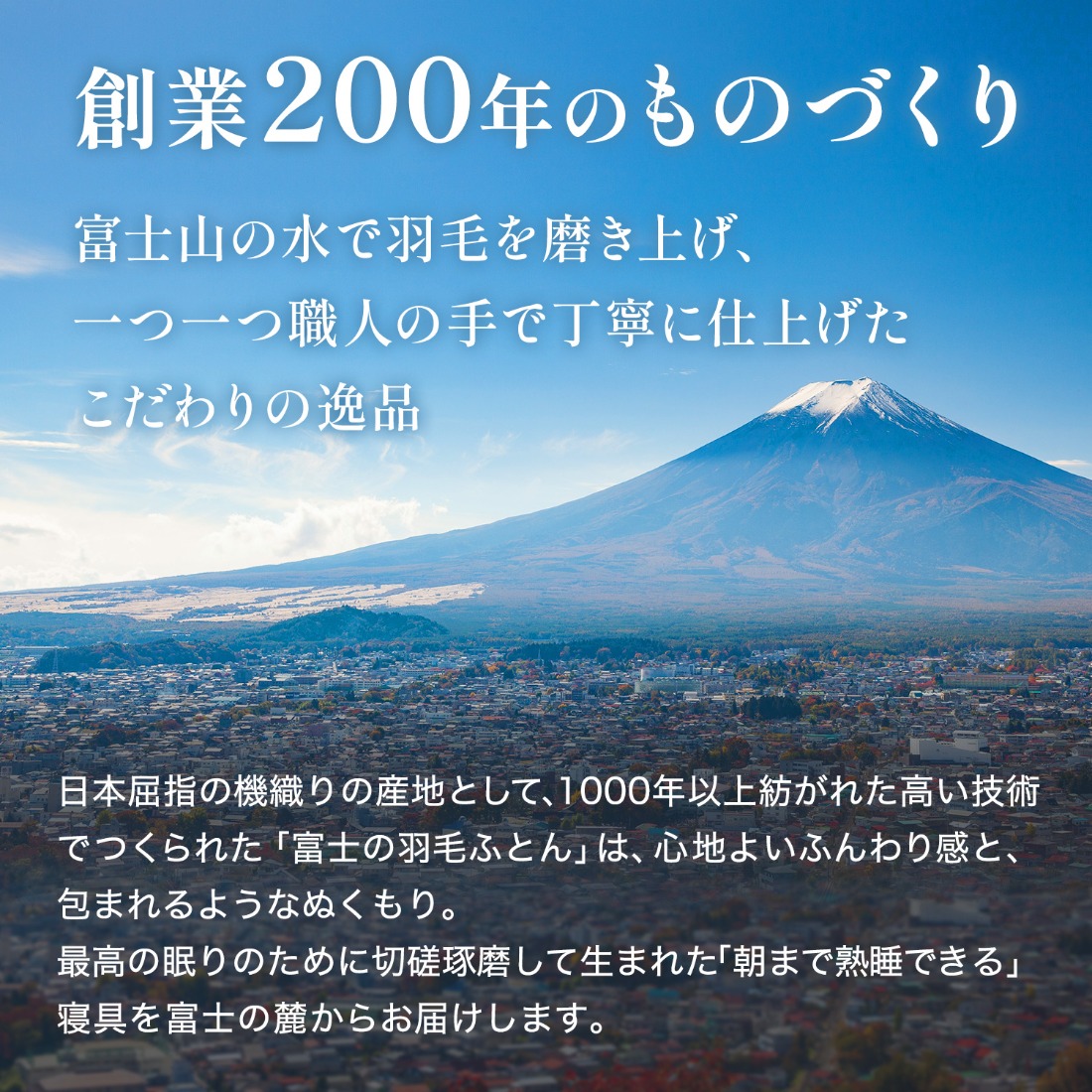 富士山麓の伏流水と凛と澄んだきれいな空気をたっぷり使って羽毛布団・マットレス・カバーリングを作っています。
